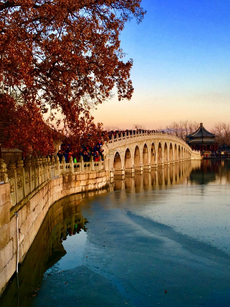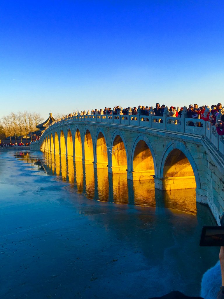 据说当年【颐和园】十七孔桥的建造者精心设计,将南回归线的落日与十七孔桥成垂直状态,因此当夕阳西下时,阳光最大程度的洒满十七孔桥的每个桥洞,并出现金光穿洞的奇特景观